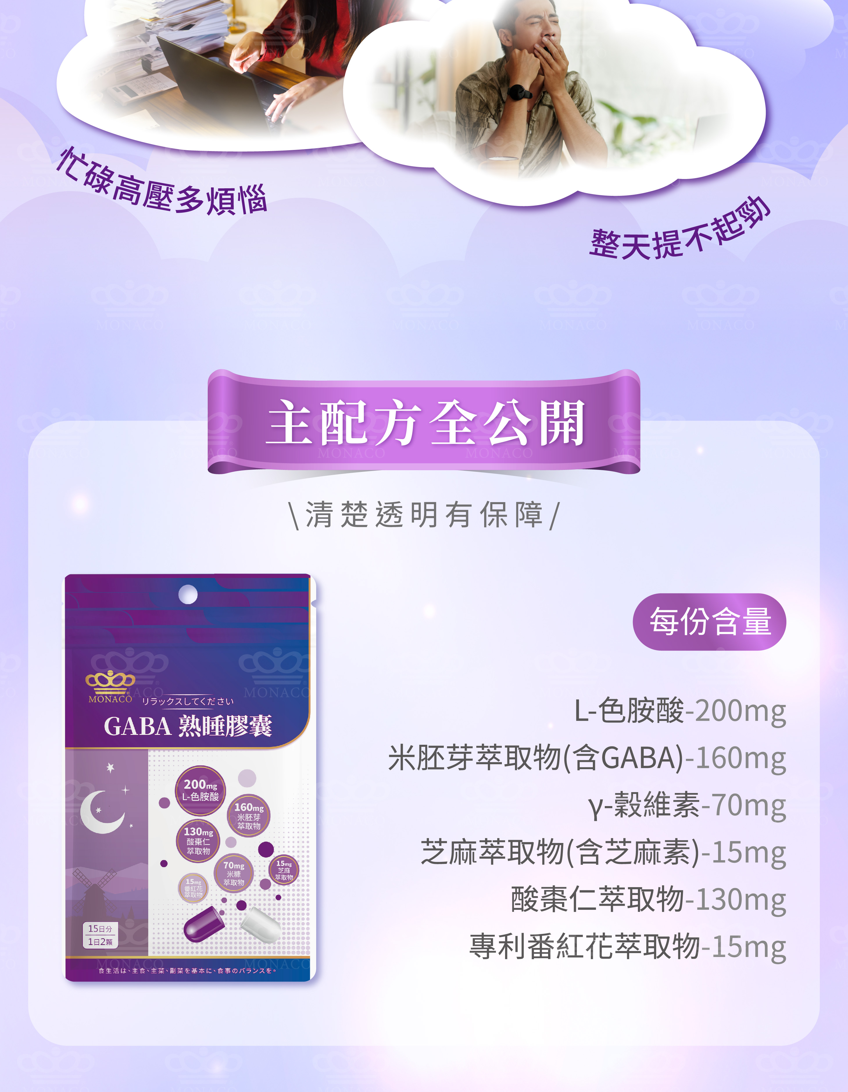 L-色胺酸 200mg、米胚芽萃取物(含GABA) 160mg、γ-穀維素 70mg、芝麻萃取物(含芝麻素) 15mg、酸棗仁萃取物 130mg、專利番紅花萃取物 15mg